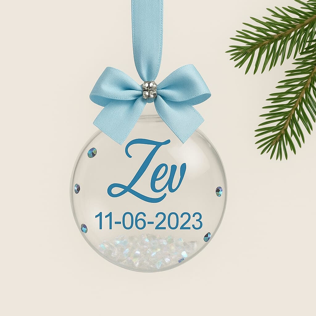 Laat de bal bedrukken met de naam en geboortedatum van jouw kleintje voor een unieke, persoonlijke herinnering die elk jaar weer straalt in de boom. 🎀