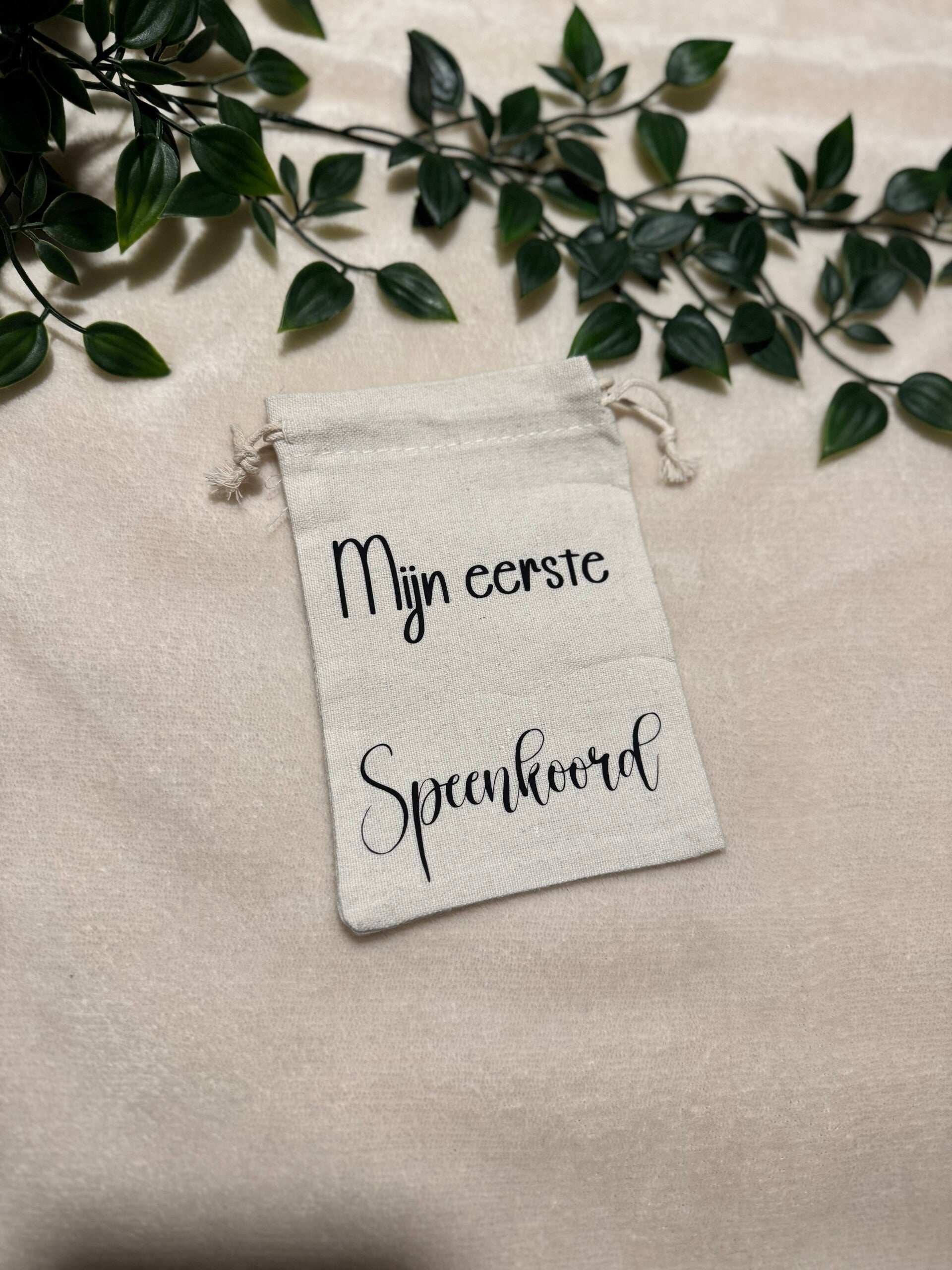 Bewaar het allereerste speenkoord van je kleintje in dit prachtige gepersonaliseerde katoenen bewaarzakje met de opdruk “Mijn eerste Speenkoord”.